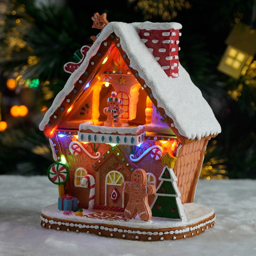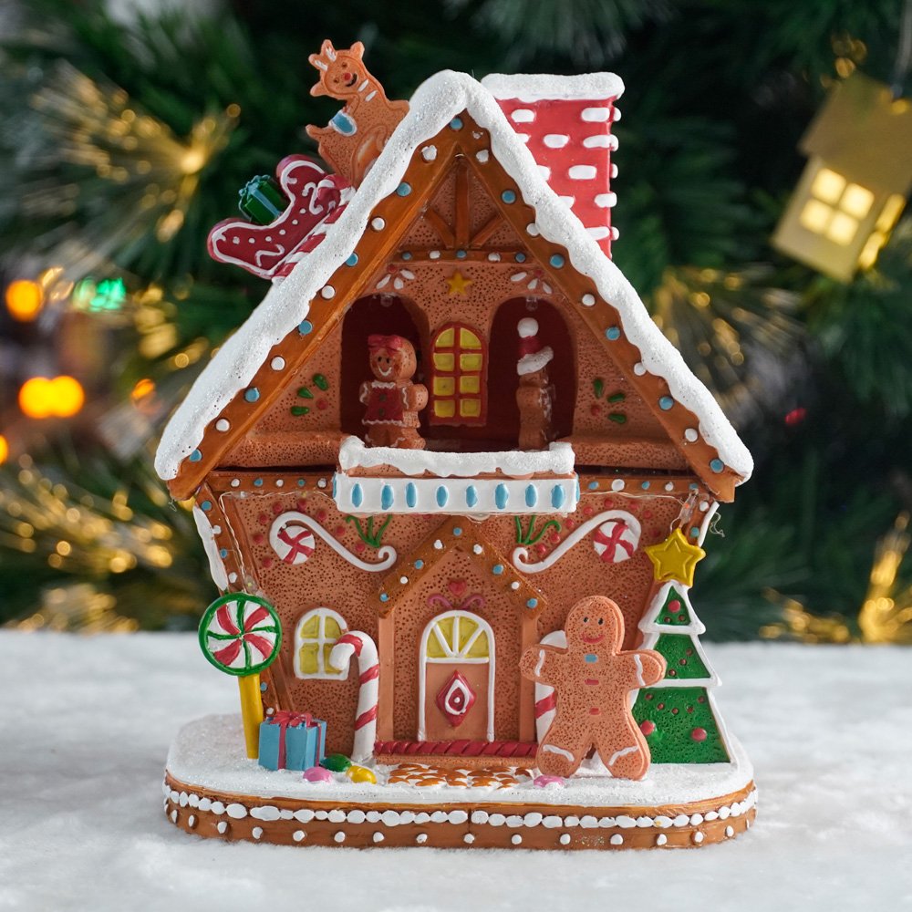 En la parte alta, cuenta con un mecanismo giratorio de galletitas de jengibre mientras que las luces LED integradas iluminan el conjunto, aportando un brillo cálido y acogedor que realza cada detalle.